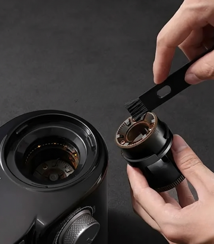 - Built-in Cleaning Brush: Integrated brush stores conveniently on the grinder body, making it easy to sweep away residual grounds from the burr chamber after each use.