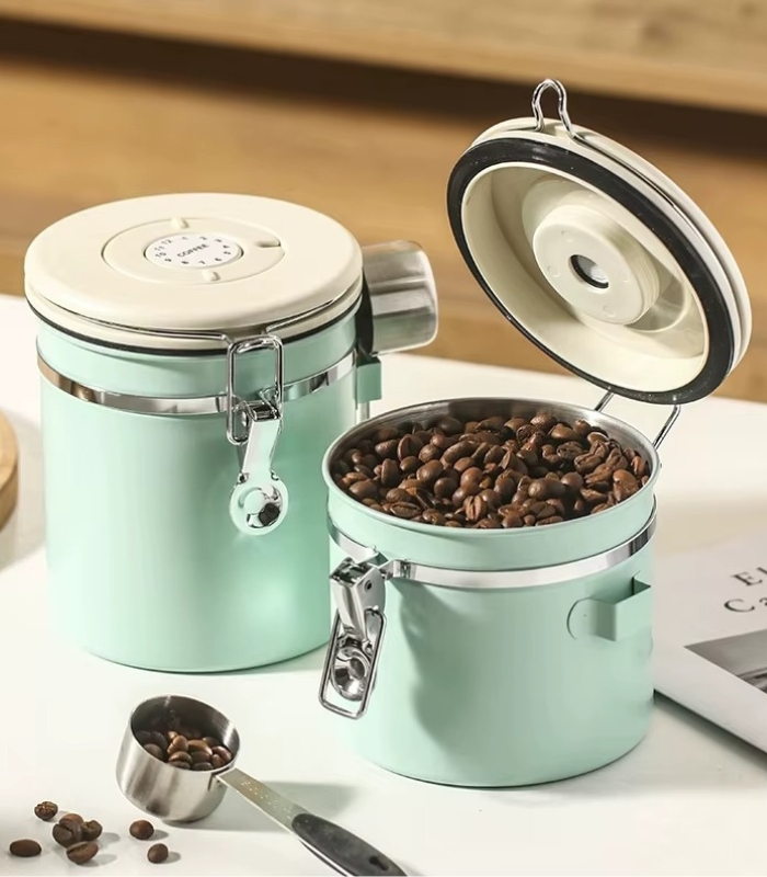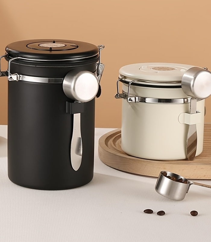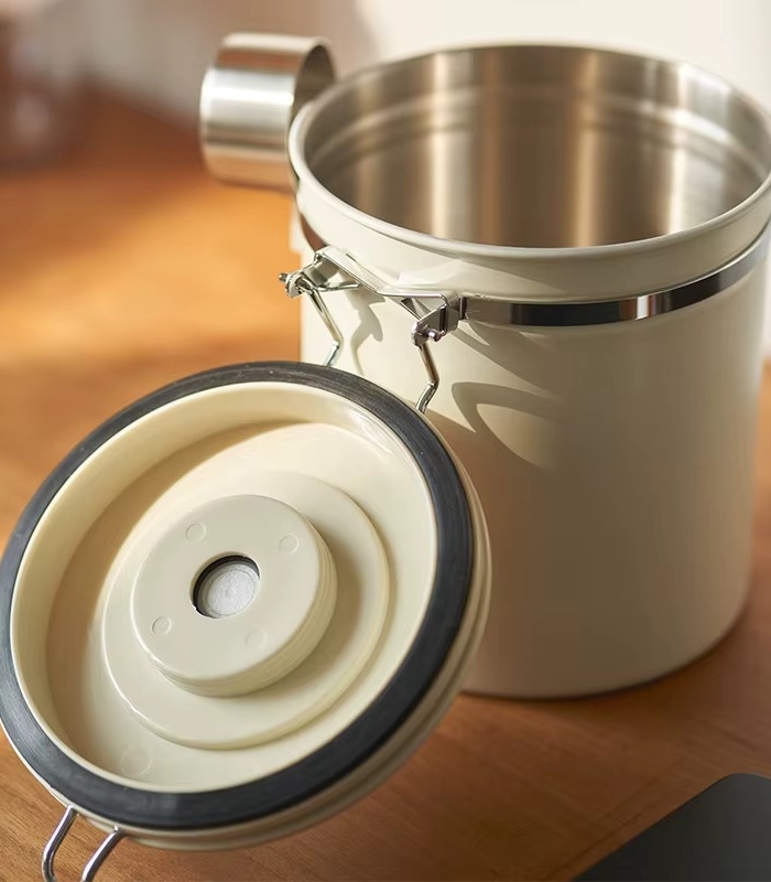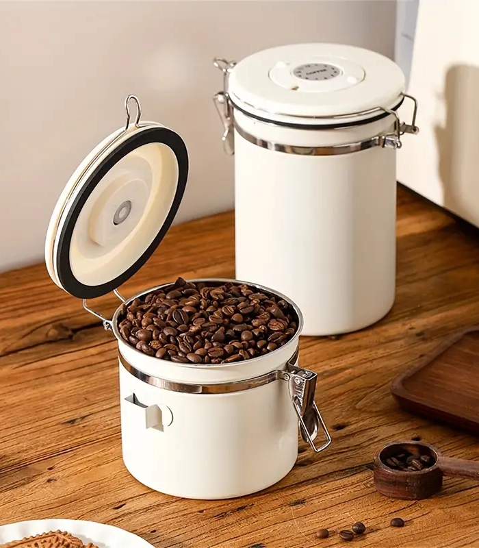 This airtight coffee storage container uses a one-way exhaust valve to release carbon dioxide while preventing air from entering, keeping beans fresh for longer. Made from 304 stainless steel with a double-seal system—a strong lock clasp and silicone ring work together to maintain freshness and preserve flavour. The date tracker dial on the lid lets you record roasting or opening dates, so you always know how fresh your beans are. Available in three sizes (1.2L, 1.5L, 1.8L) and three finishes (stainless steel, off-white, black), with a measuring spoon included.