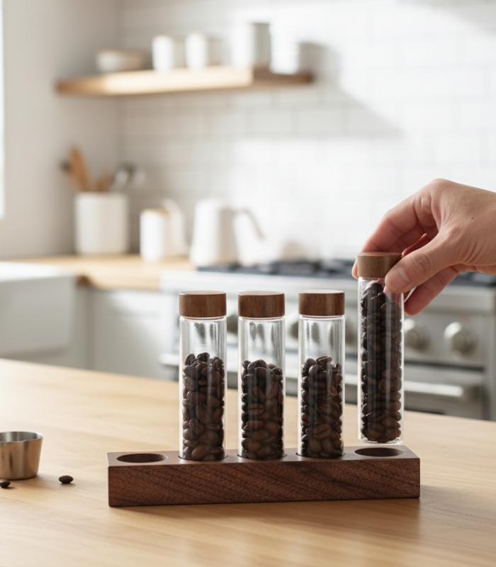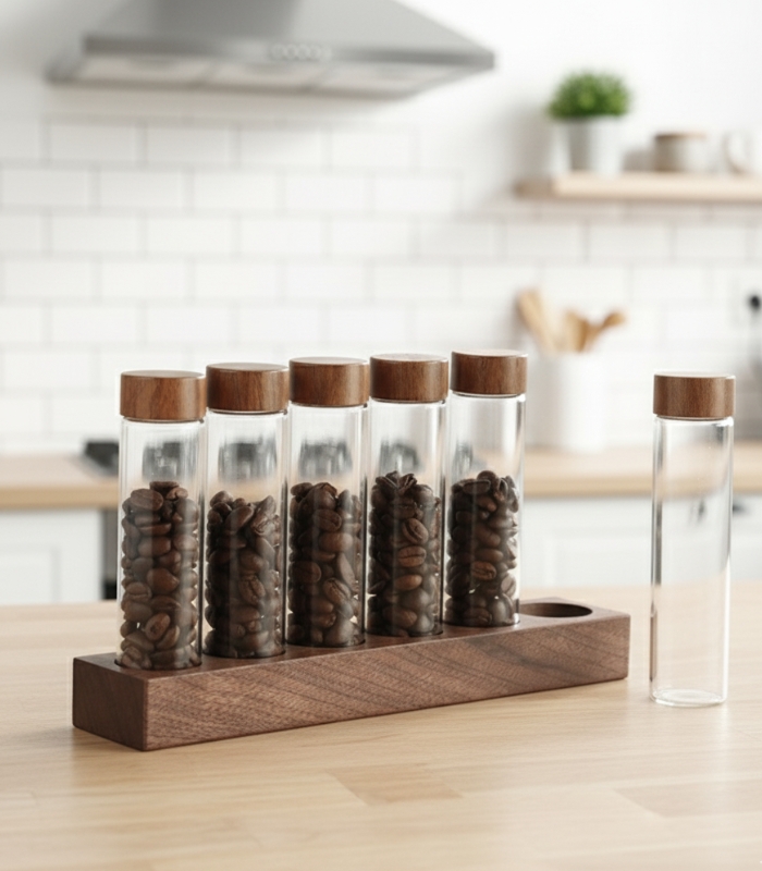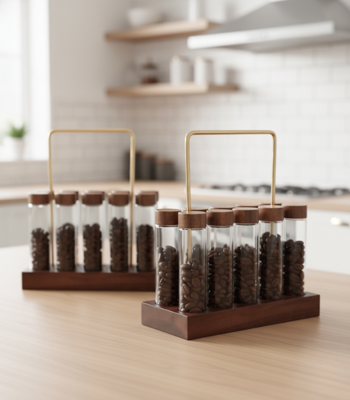Coffee Beans Storage Tubes – Single Dose Glass Vials with Wooden Display Rack