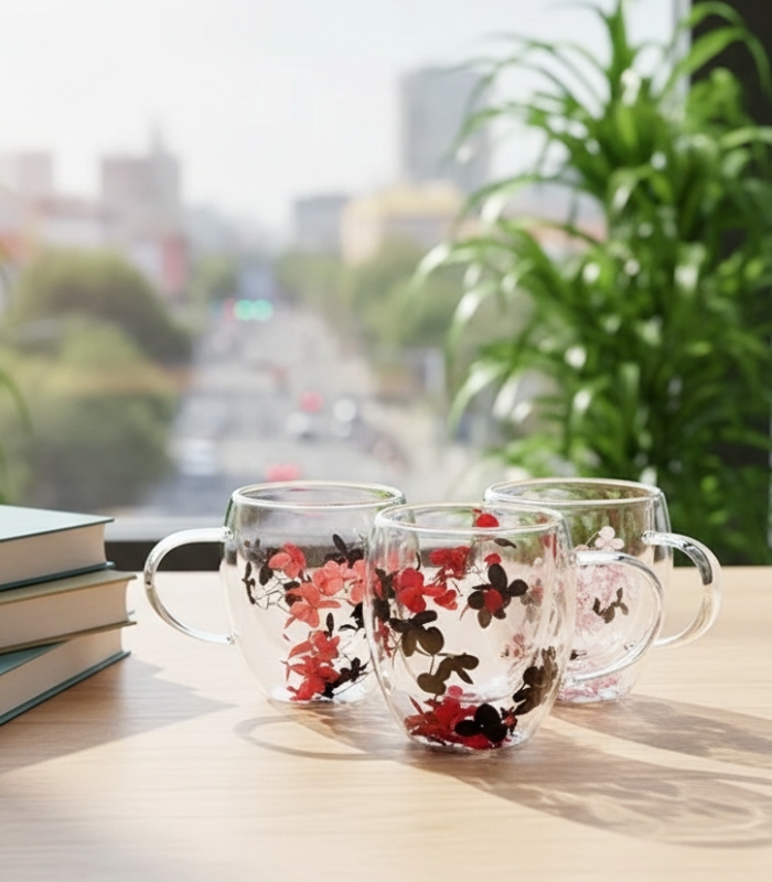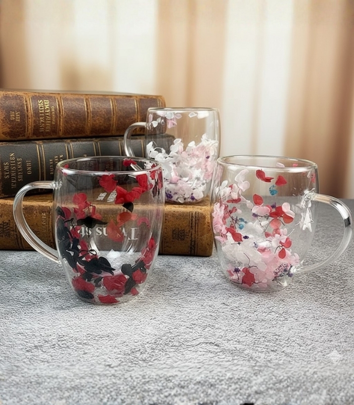 This set of two double-wall glass mugs features decorative artificial flowers permanently sealed between the glass layers, creating a unique visual effect with each cup. The borosilicate glass construction provides thermal insulation that keeps coffee or tea hot while the exterior stays comfortable to hold. The air gap between walls prevents condensation rings on furniture and maintains beverage temperature longer than single-wall mugs. Available in 250ml or 350ml capacity sets with various floral designs including red, pink, and black petal patterns. Each mug is handmade with real pressed flowers that are preserved between the glass walls, and the loose petals shift slightly when the mug is moved, creating different arrangements each time. The clear glass handle and smooth rim make it functional for daily coffee, espresso drinks, tea, or cold beverages.