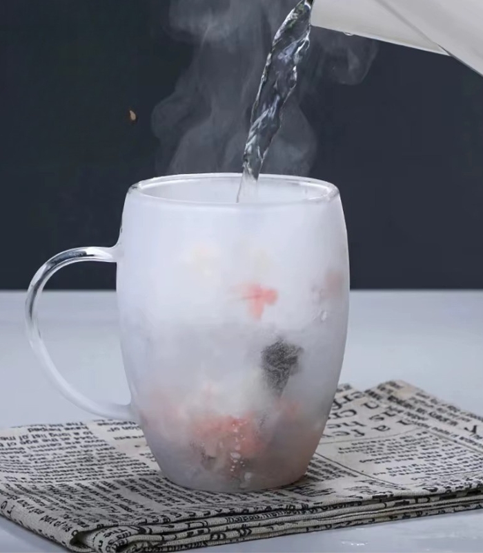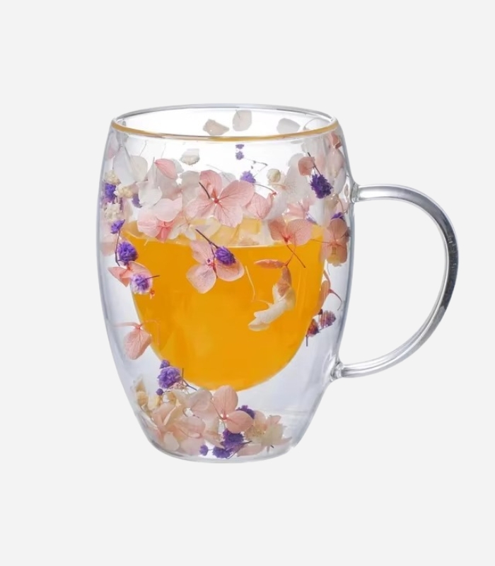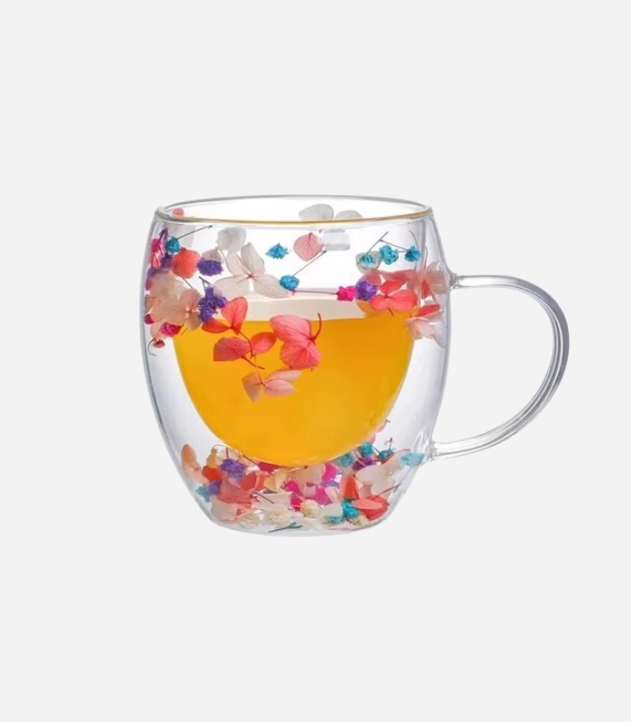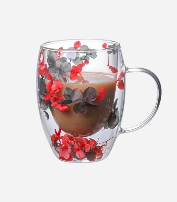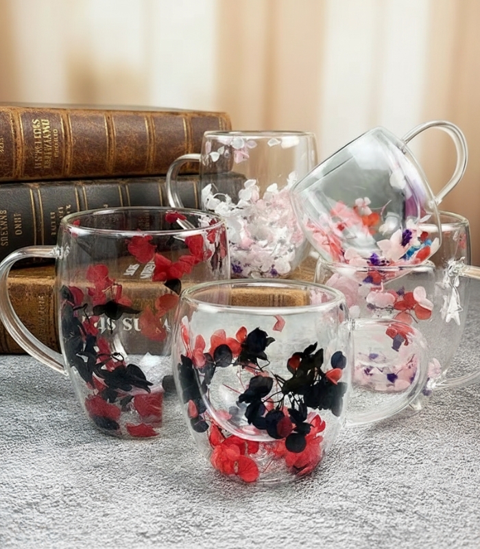 Hand wash these mugs with warm soapy water and a soft sponge to preserve the floral decoration and glass clarity. Avoid dishwashers, as high heat and harsh detergents can damage the sealed flowers over time. The double-wall construction means less heat transfers to your hand, but always test the rim temperature before drinking hot beverages, as the rim is single layer glass. The loose petals between the walls will shift when you pick up or tilt the mug, creating new patterns with each use. For best thermal performance, preheat the mug with warm water before adding hot coffee or tea. Avoid extreme temperature shocks like pouring boiling water into a frozen mug, even though borosilicate glass is heat resistant. The clear glass shows coffee or tea color beautifully, but it also shows staining, so rinse promptly after use to prevent buildup. Do not microwave, as the sealed flowers and double-wall construction may not heat evenly.