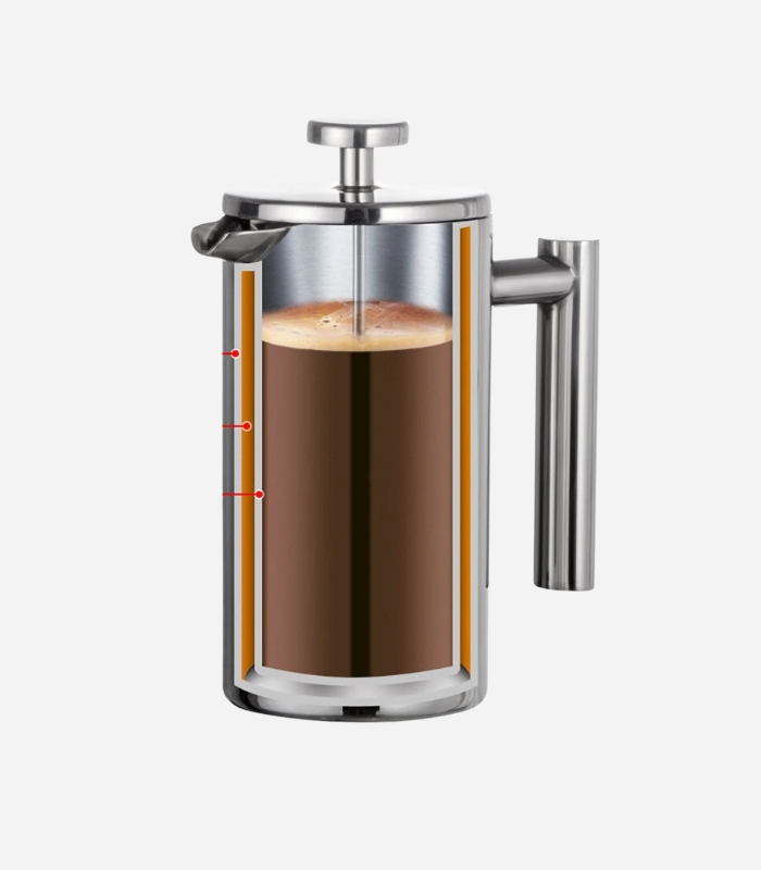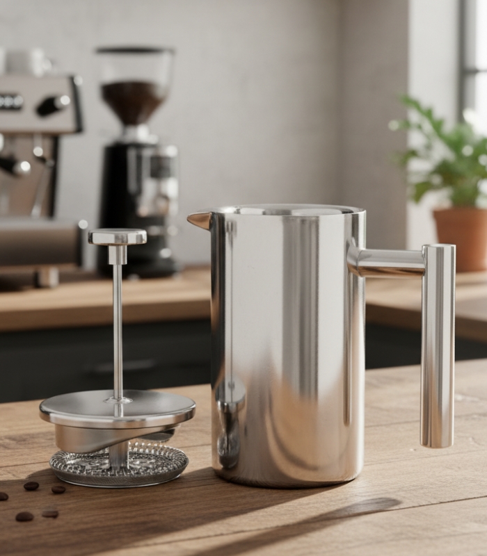 Unlike glass French presses, this polished all-metal design is unbreakable and better for travel, camping, or households with children. The mirror finish looks professional on any worktop and wipes clean easily. The double-wall insulation is a significant advantage over single-wall steel presses—your coffee stays hot longer without needing to reheat. The adjustable baffle system (visible in the lid) is a clever feature that lets you control heat retention during brewing and pouring.
