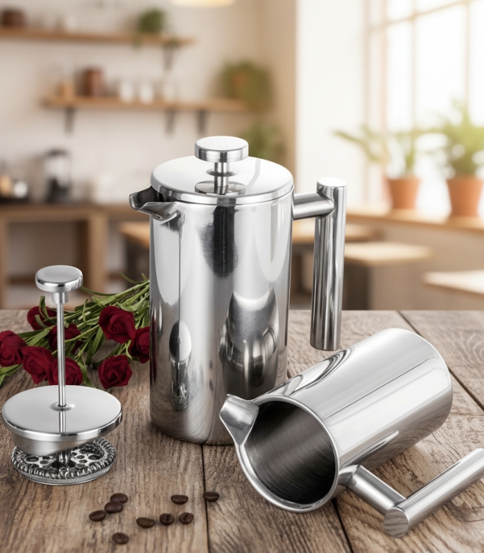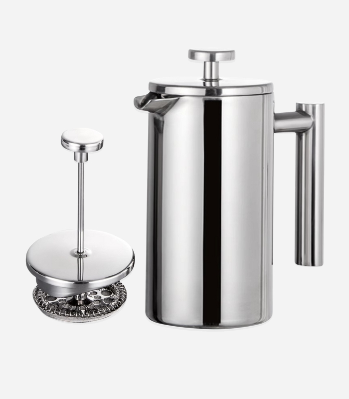 - Material: 304 food-grade stainless steel (body, lid, filter, plunger)