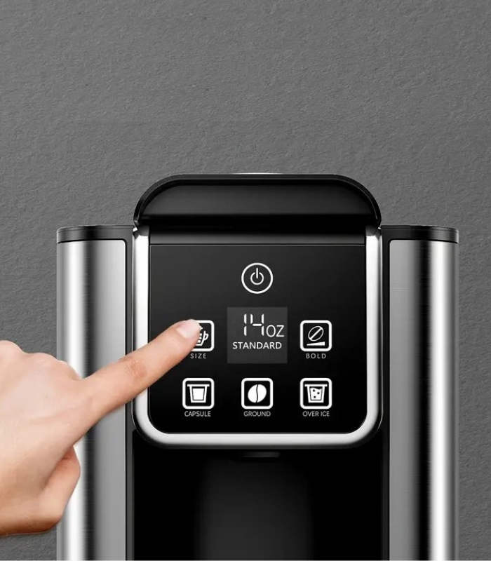 • Multifunctional Touchscreen Panel: Digital display with six brewing options including size selection, bold brew strength, capsule mode, ground coffee mode, and over-ice setting for cold beverages.