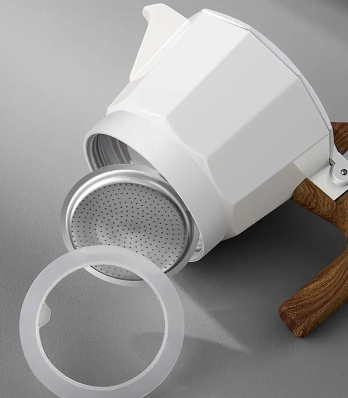 The 150ml capacity makes approximately two servings of strong coffee. The pot features a ceramic spray coating on the interior brewing chamber, which resists oxidation and cleans more easily than uncoated aluminum. A food-grade silicone gasket creates a secure seal, while the wooden handle stays cool during use.