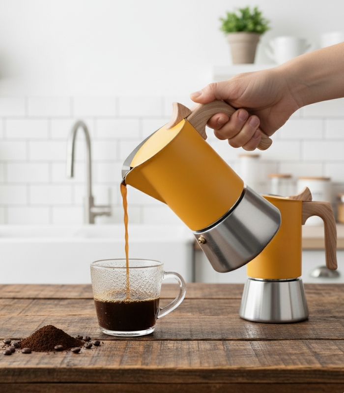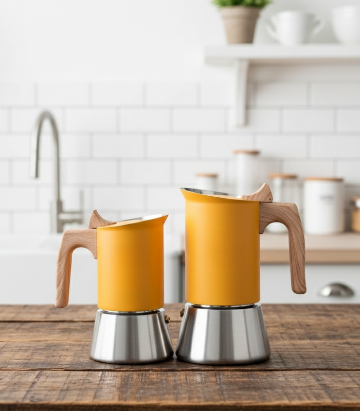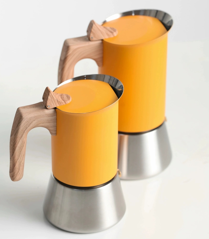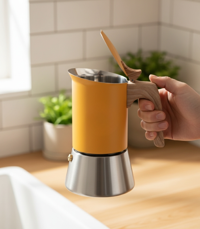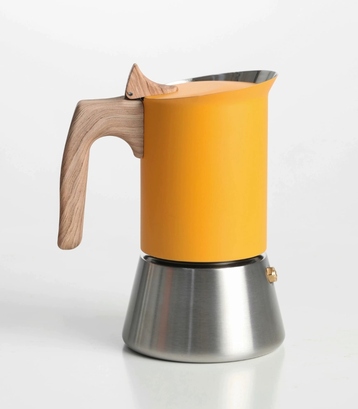 - Vibrant Matte Powder-Coated Finish: Baked-on colour coating in stylish hues (yellow, pink, silver) resists scratches and heat while adding contemporary flair to traditional moka pot design.